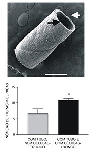 Utilizando camundongos com lesões completas do nervo ciático, os pesquisadores inseriram os cotos em tubos biodegradáveis de colágeno, e enxertaram no tubo células-tronco derivadas da medula óssea de outros animais. A idéia era aproveitar a potencialidade das células-tronco de se diferenciar em diversos tipos celulares, ou pelo menos utilizá-las como fontes de fatores prorregenerativos. Não deu outra: seis meses depois da lesão, verificaram que havia ocorrido regeneração de um número significativo de fibras, maior do que nos experimentos-controle (com tubos, mas sem células-tronco). Além disso, as fibras tinham sido envolvidas pela bainha isolante (que acelera a velocidade de condução dos impulsos), e a marcha dos animais havia sido parcialmente recuperada, muito mais do que nos animais-controle.
