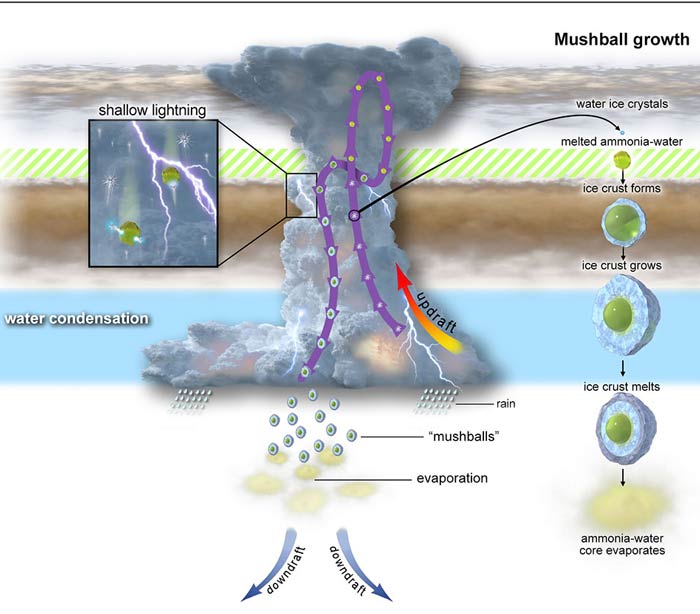 Os flashes menores originam-se em altitudes muito mais altas na atmosfera de Júpiter do que se supunha anteriormente possível. Os pesquisadores sugerem que fortes tempestades de Júpiter arremessam cristais de água e gelo na atmosfera do planeta, mais de 25 quilômetros acima das nuvens de água de Júpiter, onde encontram vapor de amônia atmosférica. O gelo derrete se tornando água líquida, que solubiliza a amônia (um volume de água dissolve cerca de 1870 volumes de amônia). Isso ocorre a uma altitude tão alta que as temperaturas estão abaixo de –88 ºC, quase tão frio quanto o coração da sua ex. O problema é que a amônia em solução promove abaixamento da temperatura de fusão da água; então, a água não congela, permitindo a formação de uma nuvem com um sistema líquido de amônia-água.