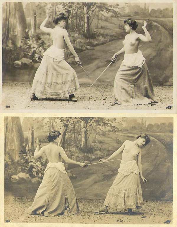A Baronesa era discípula dos princípios de Lister, e sabia que cortes davam em infecções e isso não acabava em boa coisa. Assim, temendo que os vestidos sujos de sangue causassem uma infecção, a Baronesa (acho que ela tinha outras ideias, mas vá lá) deu a ideia das duas duelarem só com a parte debaixo dos vestidos, mas não um duelo até à morte. A primeira que tomasse um corte e saísse sangue perdia. Os criados homens foram instruídos (com uma leve ameacinha básica, obviamente) se virarem, e as duas nobres ficaram de seios nus, como Deus fez e o Diabo gosta.