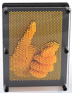 A técnica de animação pinscreen se baseia no que seu próprio nome diz: “pinos na tela”. Ela se baseia em esculturas que você pressiona vários pinos por trás de uma tela e na frente aparece o contorno, como na imagem de abertura.