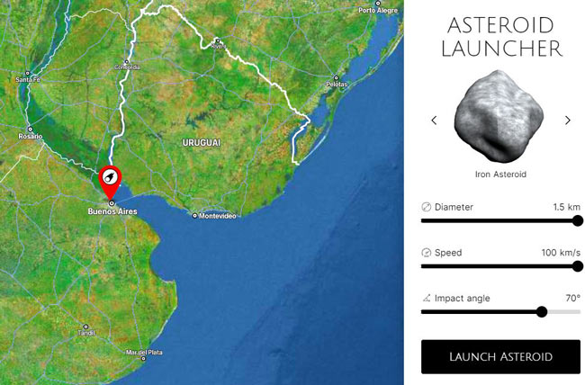 O Asteroid Launcher é exatamente o que o nome diz: Você escolhe a natureza do asteroide, o tamanho, velocidade e inclinação, e lança o fofinho em direção à Terra, caindo no ponto que você determinar. Vejamos… vamos escolher um lugar aleatório, sem nenhum motivo particular: