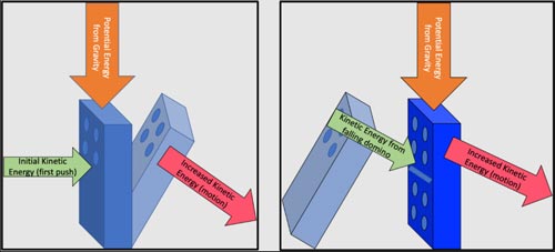 Ele explica parte do que acontece. Ele fala que para erguer o dominó é preciso ceder energia, e esta energia é armazenada sob a forma de energia potencial, que é regida pela fórmula U = m.g.h. quando o dominó recebe o toquinho, ele cai, transformando energia potencial em energia cinética, promovendo choques sucessivos, o que é característico de uma reação em cadeia.