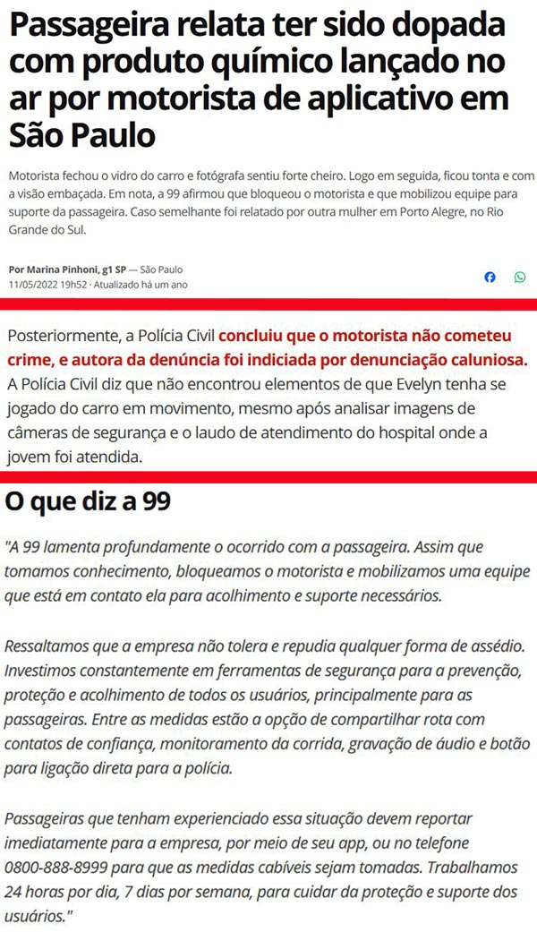 O último screenshot é da mesma matéria. Apesar dela dizer que a polícia não encontrou provas, o cara foi expulso da 99, que prestou condolências à mentirosa, e eu tenho que colocar a merda do screenshot porque vocês não irão clicar na porra dos links. A 99 baniu a passageira e a processou? Não, partiu da polícia. O que foi usado para esta mentira? Inteligência Artificial? Inútil, não se precisa dela.