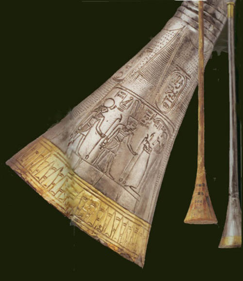 Mas há algo interessante na tumba de Tut. Ok, tudo lá é interessante, mas eu só vou falar de uma coisa: trombetas. Sim, tinha trombetas lá, mas não eram quaisquer trombetas; eram trombetas militares. As trombetas militares de Tutancâmon são um dos três exemplos conhecidos deste instrumento preservado do antigo Egito, e foram feitas de folhas de metal cobertas de ouro.