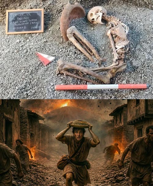 Ao lado dos restos mortais, os arqueólogos encontraram o bacião de barro quebrado, uma lanterna a óleo, um anel de ferro e dez moedas de bronze. Um inventário pequeno, mas eloquente. Não era alguém que saiu para explorar. Era alguém que saiu para fugir, levando o que dava, como dava, com a vaga esperança de chegar ao mar e sobreviver.Alguém que tentou proteger sua cabeça da maneira como pôde.