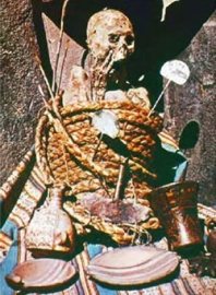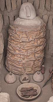 Essa coisa aí do lado, embrulhado pra presente, é um morto. Normalmente, as pessoas eram tratadas com ervas aromáticas, e colocadas numa espécie de casulo com diversas camadas de linho, junto com milho, tigelas, pertences e vestimentas próprias, como um cocar de penas. Alguns desses “pacotes” chegavam a pesar cerca de 140 quilos, garantindo que nosso querido parente fosse pro pós-vida bem confortável, quentinho e com um farnel para se alimentar durante a jornada.